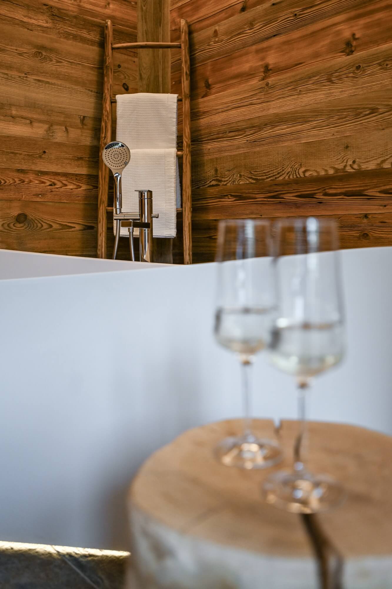 The bathtub, placed at the window, creates an atmosphere of soft romance ideal for a warm relaxing bath with a fabulous view of the surrounding mountains stretching as far as the eye can see.